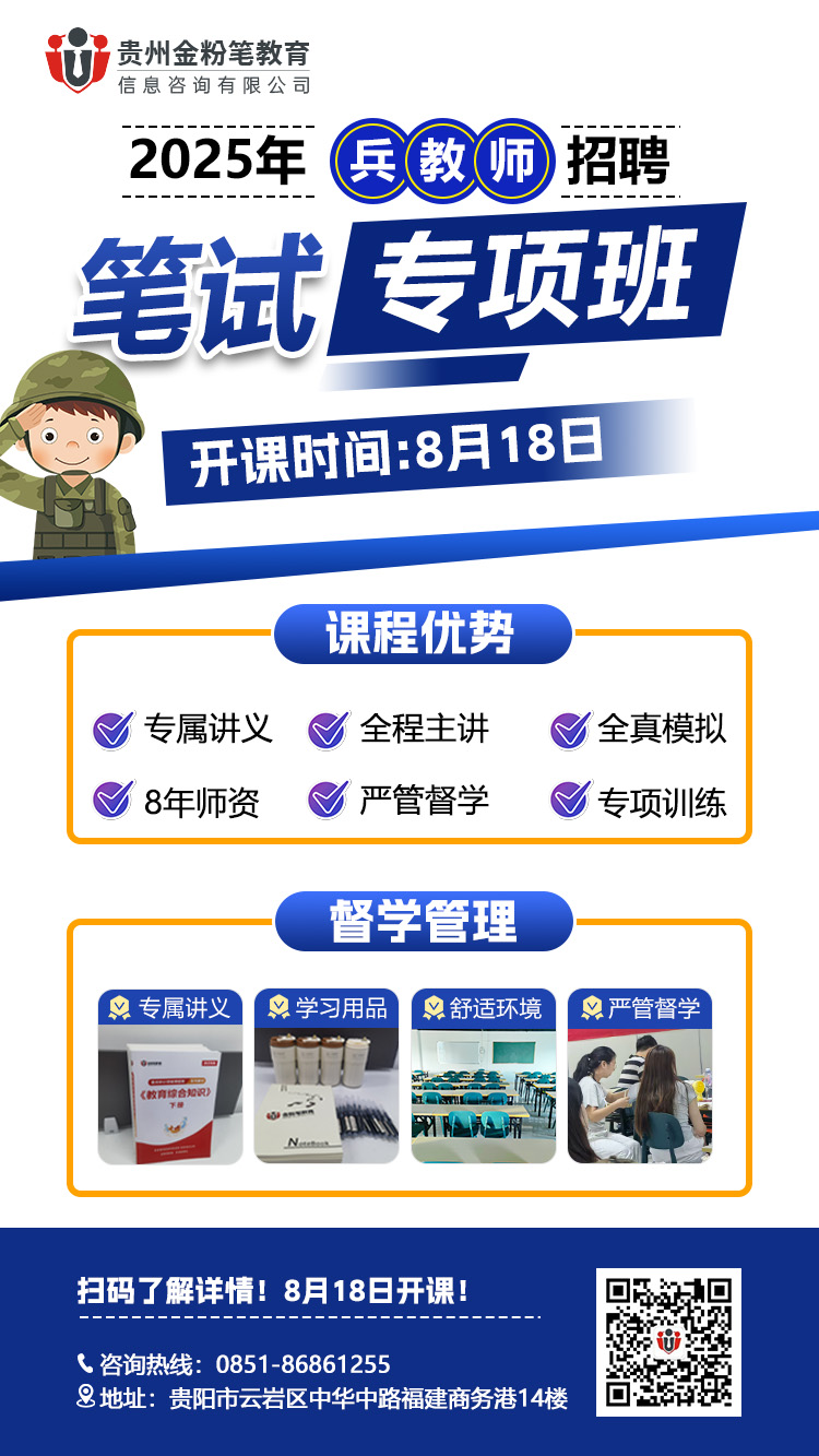 贵州金粉笔2025年贵阳市中小学“兵教师”笔试培训课程来了,开课时间8月18日,开课前预约课程可享优惠,贵阳兵教师笔试班预约及咨询:13368515037(微同)。