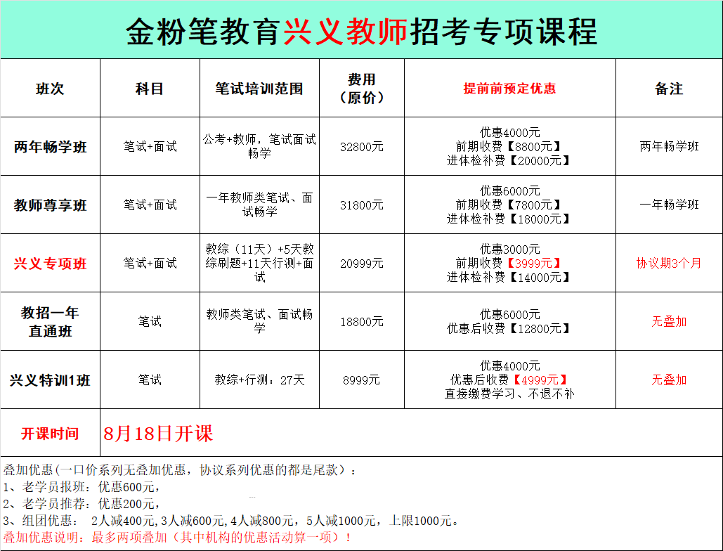贵州金粉笔2025年兴义市教师笔试培训班来了,开课时间8月18日、8月25日,班次多样,可根据自身需求选择适合的班次。兴义市教师笔试班预约及咨询:13368515037(微同)。