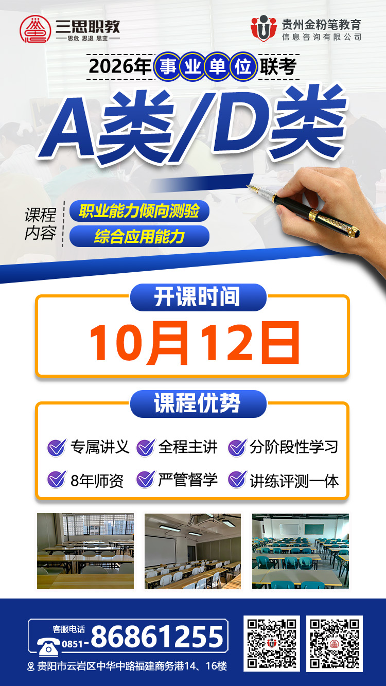 贵州三思职教26年贵州事业单位联考笔试班来了,开课时间2025年10月12日,职测+综应,在开课前预约或报班,可享最大课程优惠,贵州事业单位笔试班预约或咨询:13368515037(微同)。