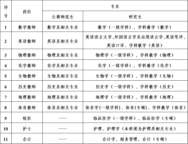 2026届六所教育部直属师范院校公费师范毕业生(北京师范大学、东北师范大学、华东师范大学、华中师范大学、陕西师范大学、西南大学),所学专业与报考学科一致;应往届全日制硕士及以上研究生,所学专业与报考学科(教师岗位)一致;须具备报考的相应学科的高级中学教师资格证、普通话等级证(公费师范生可在办理入编前提供;往届研究生应在报名时提供,2026届应届研究生应在确定拟录用时提供);会计、校医(护士)岗位应具备国家规定的从业资格。