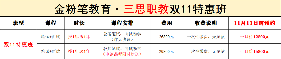 贵州金粉笔.三思职教双十一公考课程优惠来了,在11月11日前预约公考课程,报一年送一年,笔试、面试畅学。公考课程预约及咨询:13368515037(微同)