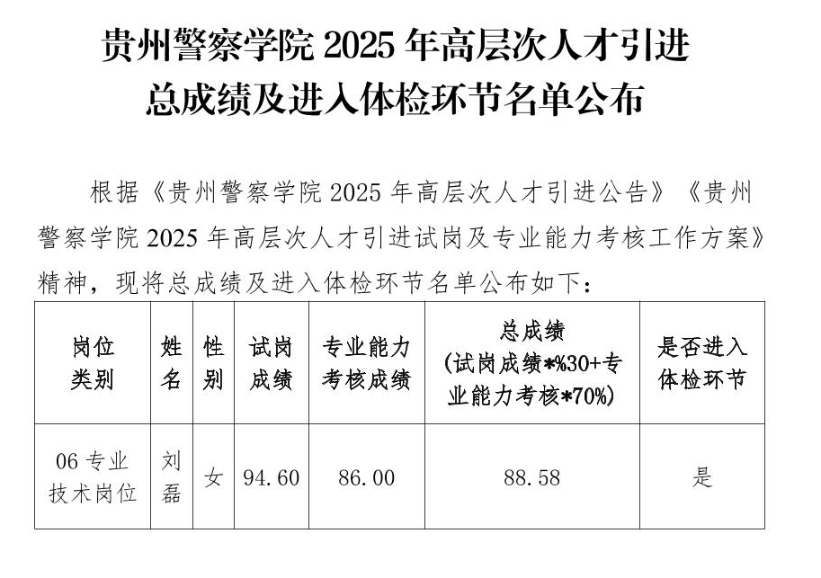 贵州警察学院2025年高层次人才引进总成绩及进入体检环节名单公布