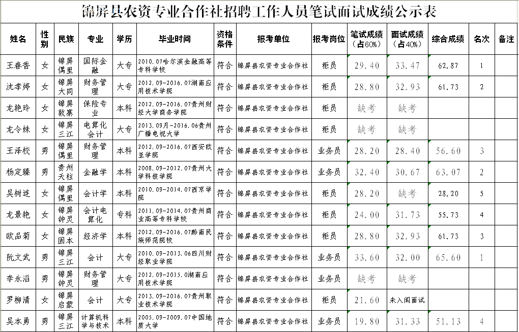 锦屏县农资专业合作社招聘工作人员笔试面试成绩公示表