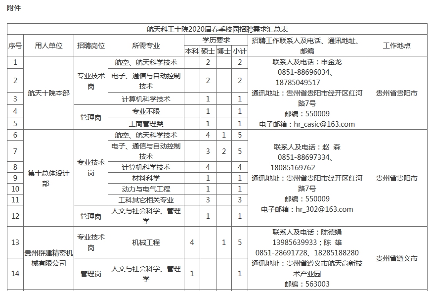 附件:航天科工十院2020届春季校园招聘需求汇总表