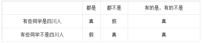 同样,我们再来看看有些s是p与有些s不是p之间的规律。分别举例子为有些同学是四川人与有些同学不是四川人。通过以下表格所示: