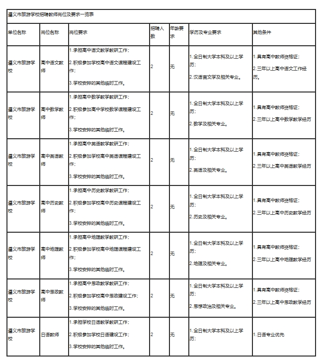 (二)招聘人数:拟招聘教师14人。具体招聘岗位及要求详见《遵义市旅游学校2023年公开招聘教师岗位及要求一览表》(附件)。