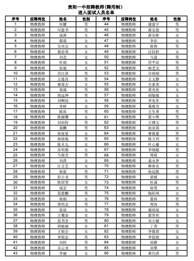 贵阳一中本次招聘教师(聘用制)投递简历已结束,现将进入面试环节人员名单公布如下,请进入面试人员于2023年12月22日18:00前加入QQ群:545052637,备注“应聘岗位+姓名”,面试通知将在群内发布,未能及时加群的视为自动放弃。