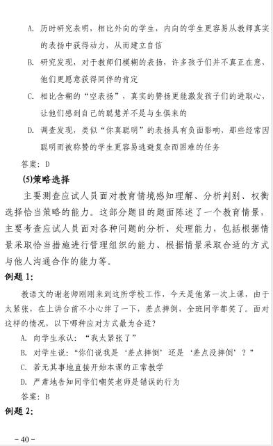 贵州教师招聘考试信息网:2020年贵州事业单位中小学教师招聘D类笔试考试大纲已发布,笔试科目考《职业能力倾向测验(D 类)》和《综合应用能力(D 类)》,《职业能力倾向测验(D 类)》是针对中小学和中专等教育机构的教师岗位公开招聘工作人员而设置的考试科目,主要测查与 中小学教师职业密切相关的、适合通过客观化纸笔测验方式进行 考查的基本素质和能力要素,包括常识判断、言语理解与表达、 数量分析、判断推理、策略选择等部分。