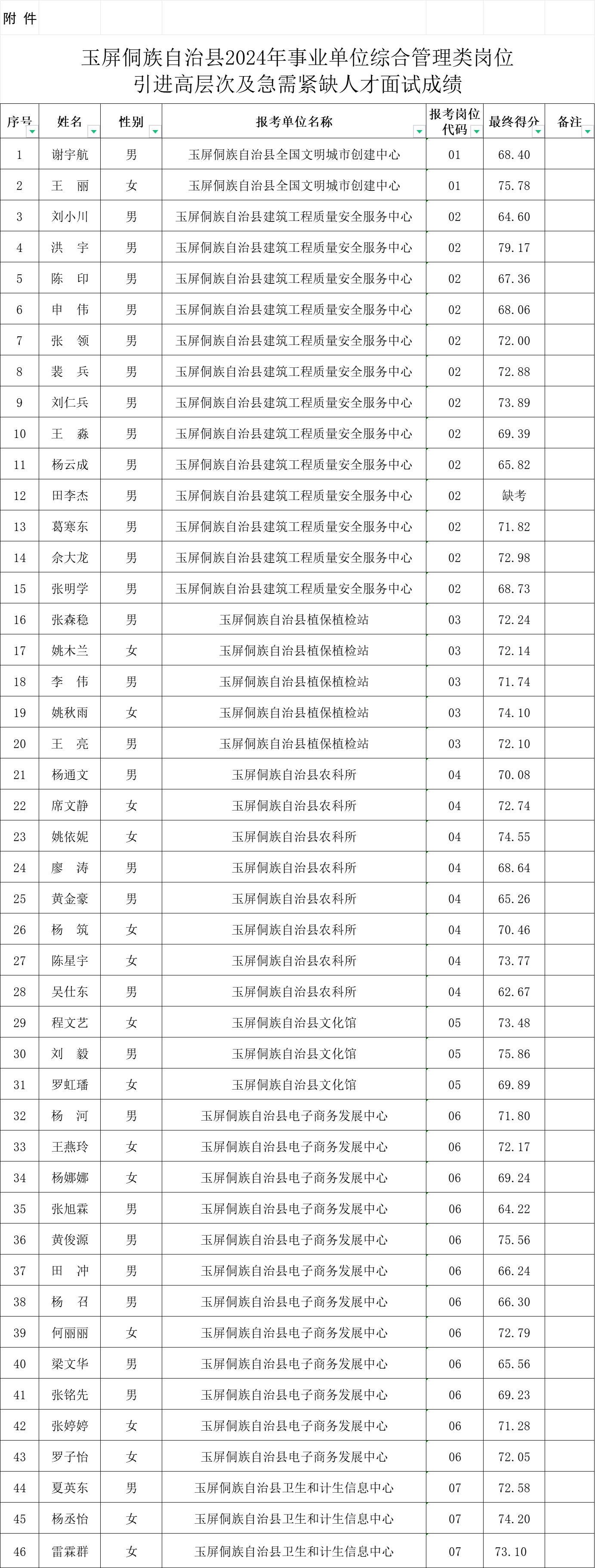 附件:玉屏侗族自治县2024年事业单位综合管理类岗位引进高层次及急需紧缺人才面试成绩