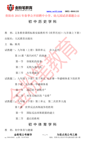 贵阳市2015年春季公开招聘中小学、幼儿园试讲课题公示