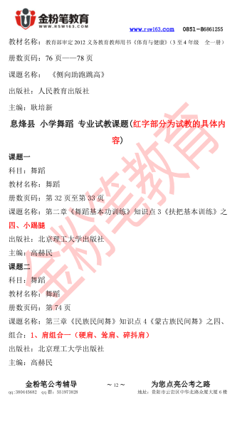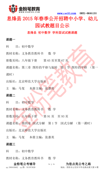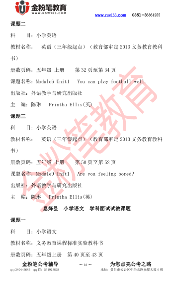 清镇市2015年春季公开招聘中小学幼儿园教师试教篇目