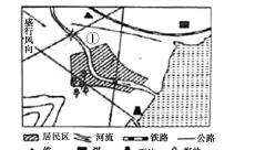 解析:图 中显示信息为:西北风、居民区位于风向下方、河流流进居民区。①所处位置为紧邻河流的上流,从城市环境保护和企业运营成本考虑的角度出发:(1)①所处位 置不能是污染型企业,否则污染物质经西北风便吹入城区;(2)①所处位置临近河流,最好是需水量较大的企业。因此①处只能是自来水厂。故本题选D。