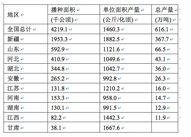 D选项,新疆总产量367.7万吨,全国总计616.1,新疆占全国的一半以上,D选项正确。