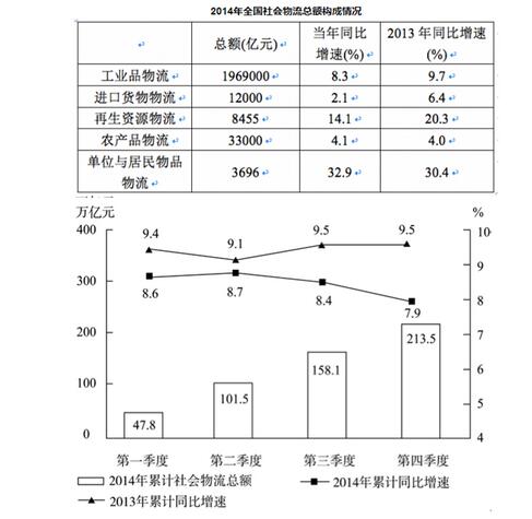2014年全国社会物流总额213.5万亿元,同比增长7.9%,比上年回落1.6个百分点。