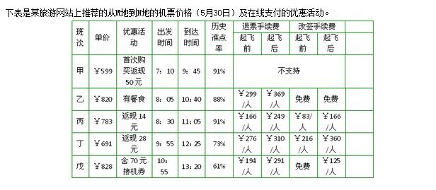 131.5月30日早晨,王先生由于记错了时间,10︰30到达机场时,所购班次的飞机已经起飞,幸运的是隔天同一班次的机票还有售,且价钱不变,于是在窗口办理了改签。加上之前网上订票的费用,王先生一共花费了900多元,他所购买的最可能是哪个班次的机票( )