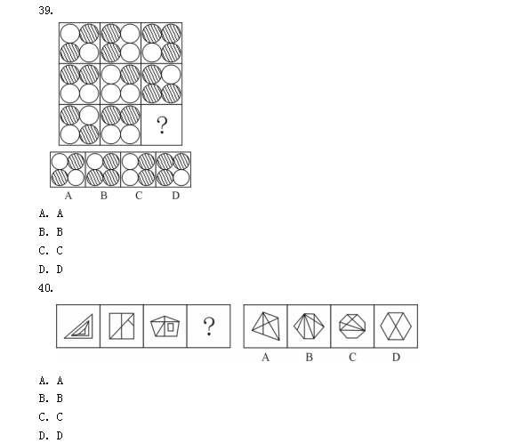 40.B【金粉笔解析】本题考查数量类里面直线与面的数量。前三个图形面的数量为4,5,6,第四个图形应为7个面,排除A、D选项,前三个图形外围直线数为3,4,5,第四个图形外围直线数应为6.因此,本题答案为B选项。