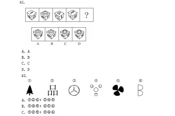 41.C【金粉笔解析】本题考查图形的样式求同,前四个图形每相隔两个图形组成图形相同,第五个图形应与第一个和第三个图形组成图形相同,注意图形的立体箭头与平面箭头的区别。因此,本题答案为C选项