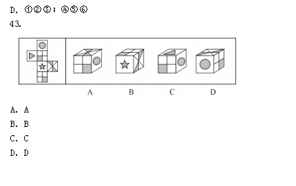 43.D【金粉笔解析】本题考查重构推理,A项中黑色正方形的位置应该在右上方,B项中右面中黑色三角形的位置出现错误,C项中圆形的位置应为五角星。因此,本题答案为D选项。