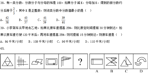 40.【答案】A。金粉笔教育解析:题干图形都含有四个封闭区域,只有A项符合。