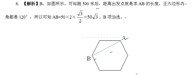 6.老王围着边长为50米的正六边形的草地跑步,他从某个角点出发,跑了500米之后,距离出发点相距有多远( )