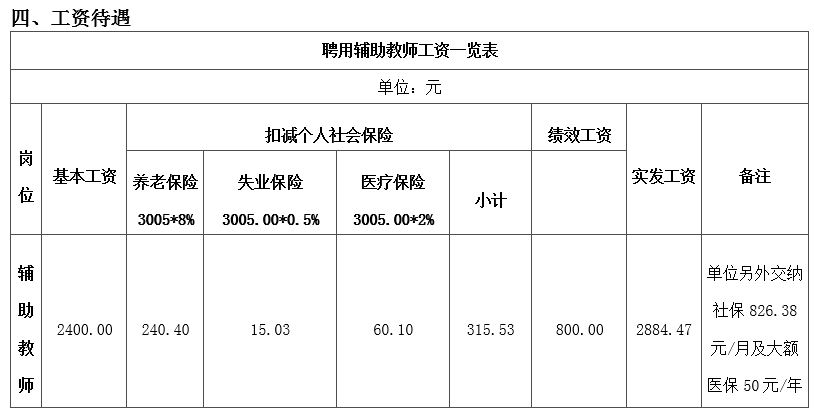 聘用人员签订劳动合同,实行试用期,期限为2个月。(试用期工资按2400.00元发放,无绩效工资)。试用期满后,绩效工资按学校考核办法发放。