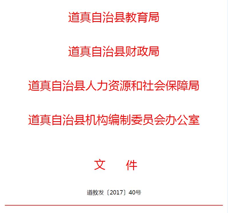 根据《省教育厅省财政厅 省人力资源和社会保障厅 省机构编制委员会办公室关于印发〈贵州省2017年农村义务教育阶段学校教师特设岗位计划实施方案〉的通知》(黔教师发〔2017〕91 号)、《省教育厅关于印发贵州省2017年农村义务教育阶段学校教师特设岗位计划招聘办法的通知》(黔教师发〔2017〕95号)和《遵义市教育局关于印发〈遵义市2017年农村义务教育阶段学校教师特设岗位计划招聘办法〉的通知》(遵教人〔2017〕4号)精神,现将《道真自治县2017年农村义务教育阶段学校教师特设岗位计划招聘细则》印发给你们,请遵照执行。