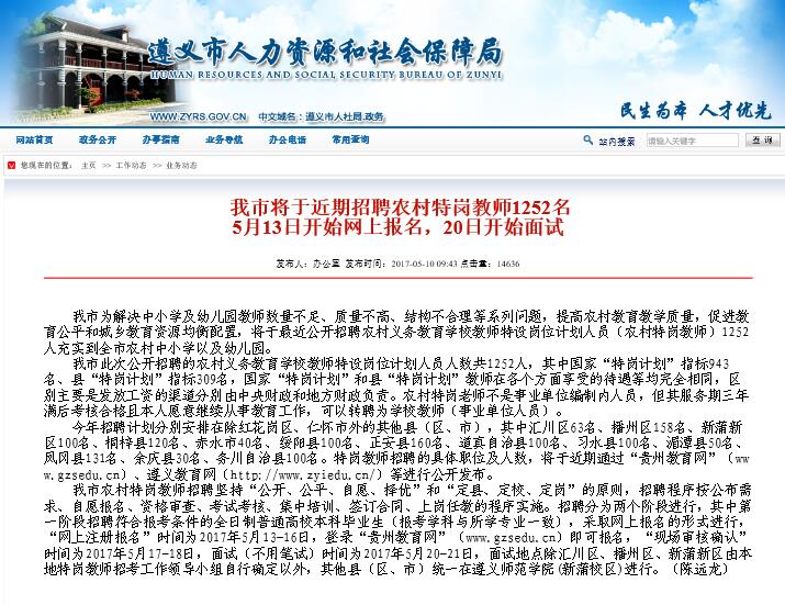 5月10日,从遵义市人力资源和社会保障局官网获悉,我市将于近期招聘农村特岗教师1252名,其中余庆县30名。