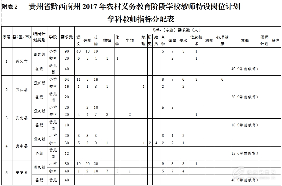 黔西南州“特岗计划”指标880名(其中国家“特岗计划”指标645名、县“特岗计划”指标235名),其中兴义市150名、兴仁县100名、安龙县50名、贞丰县62名、普安县160名、晴隆县120名、册亨88名、望谟县100名、义龙新区50名(具体指标分配详见附表2)。