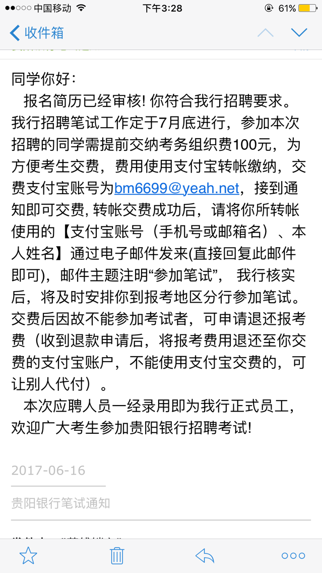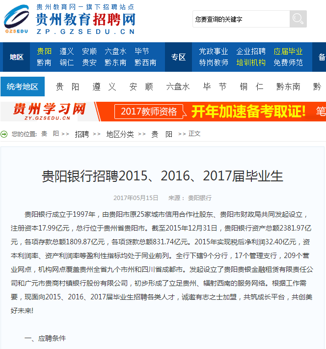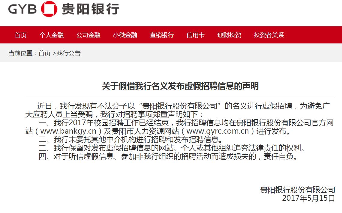 前段时间(2017年05月16日),因工作人员一时疏忽,在公司官网转载了一则关于贵阳银行招聘的虚假信息,如下图(现已删除):