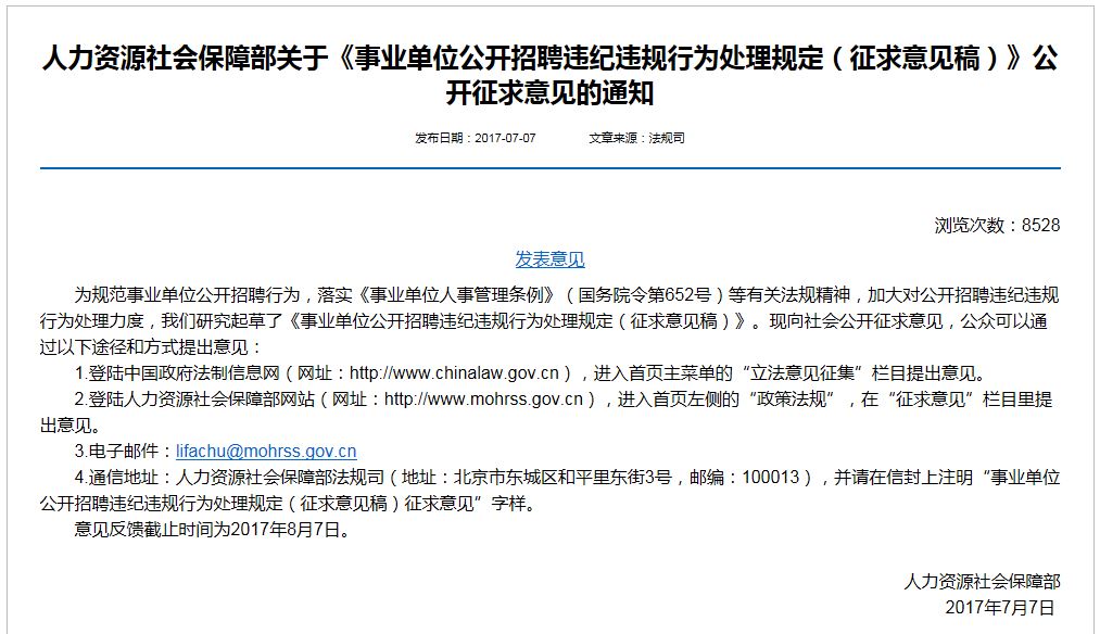 2017年7月初,中华人民共和国人力资源和社会保障部发布《事业单位公开招聘违纪违规行为处理规定(征求意见稿)》的通知。具体原文如下: