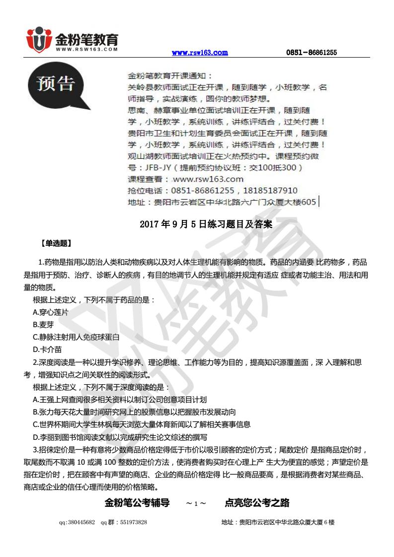 2017年9月9日贵州事业单位联考笔试真题及答案