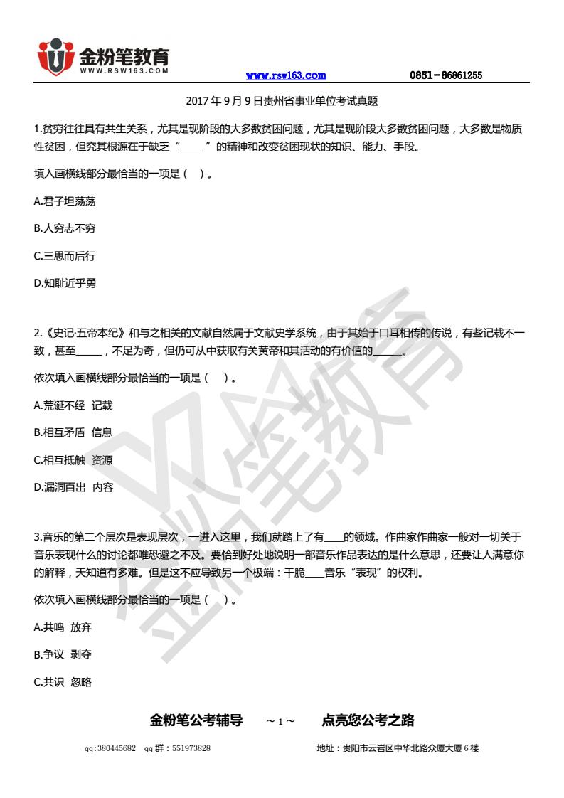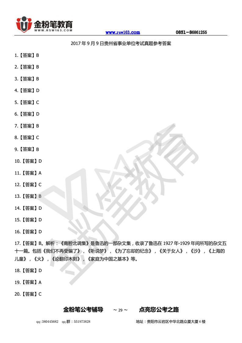 2017年9月9日贵州事业单位联考笔试真题及答案