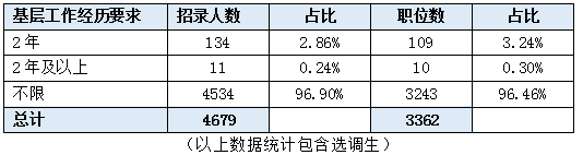 从总整体来看,贵州公务员考试招录对考生工作经历的要求比较宽松,仅有145人、119个职位要求2年及2年以上工作经历,占总数的3.5%左右,与去年相比略有降低,96.46%的职位不限制基层工作经验,应届生可以报名,对于应届生而言是利好消息,在此将工作经历的相关规定列出来,供大家参考: