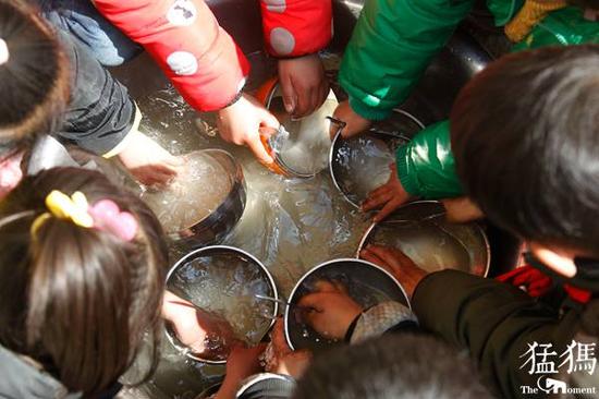 由于水源宝贵,在这里洗碗最重要的是节约用水。在一只大盆里,孩子们先将碗筷上的饭渣和油渍洗掉,然后再跑到自来水龙头前将碗筷冲净。