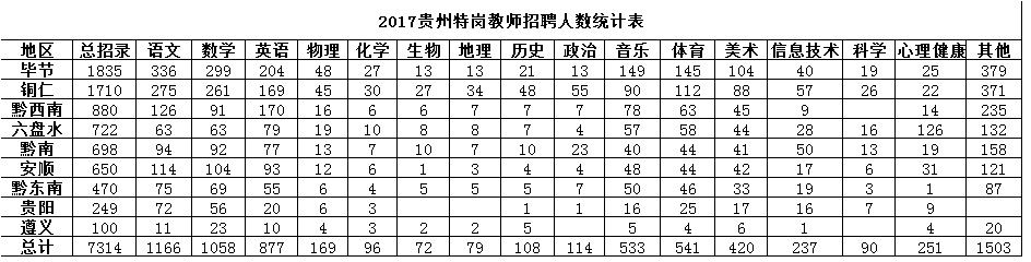 2017年贵州特岗教师招聘各学科人数统计表