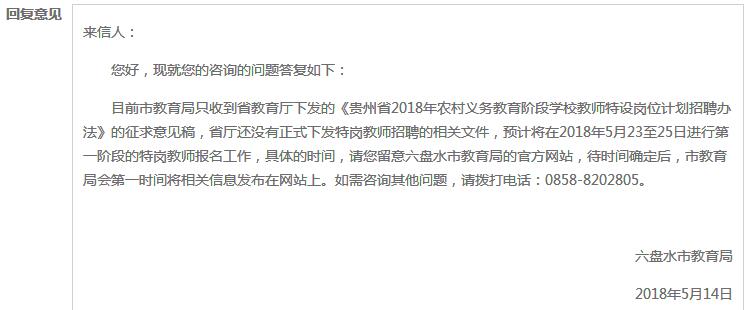 另外在5月11日,经六盘水教育局了解核实,《贵州省2018年农村义务教育阶段学校特设岗位计划招聘办法》正式文件还没发布,预计将在2018年5月23日至25日进行第一阶段的特岗教师报名工作。具体时间,需关注官方网站。