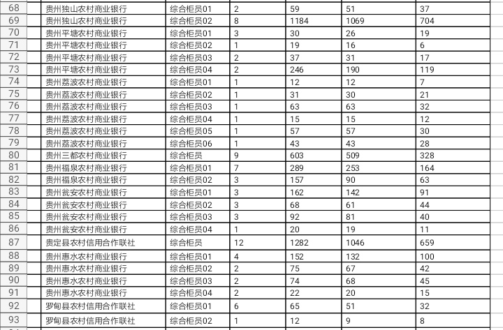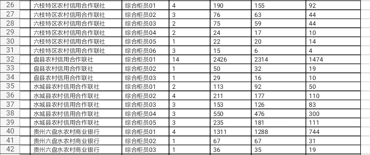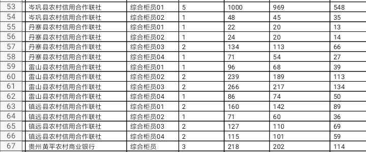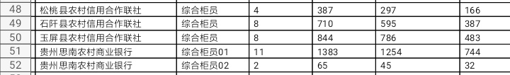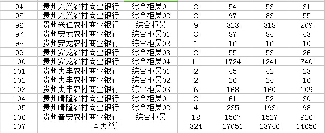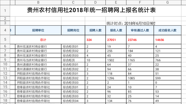 2018年贵州农信社招聘324人报名已经进入第四天,报名首日至6月10日上午9:00,报名人数共有27051人,其中通过审核的有23746人,成功报名人数为14656人。此次报名时间为6月7日上午9:00至6月11日下午5:00。现将各个地市的报名人数统计如下。