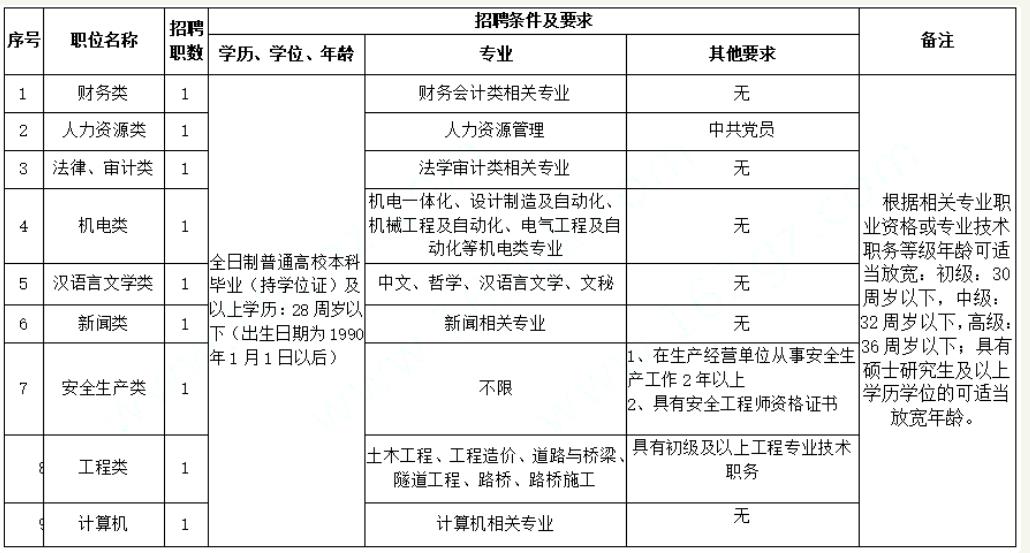 面向社会招聘合同制专业技术人员9名,其中财务类1名、人力资源类1名、法律或审计类1名、机电类1名、汉语言文学类1名、新闻类1名、安全生产类1名、工程类1名、计算机类1名(具体招聘条件及要求详见附件1:贵州高速公路集团有限公司水城营运管理中心2018年专业技术人员公开招聘条件一览表)。