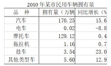2010 年末,某市民用车辆拥有量达 309.7 万辆,同比增长 8.7%,其中,进口车拥有量 12.54 万辆,增长 43.2%。