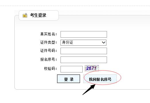 再次,点击进入,进入准考证入口,填写正确消息,点击登录,如果忘记报名序号,可以点击找回序列号,如图: