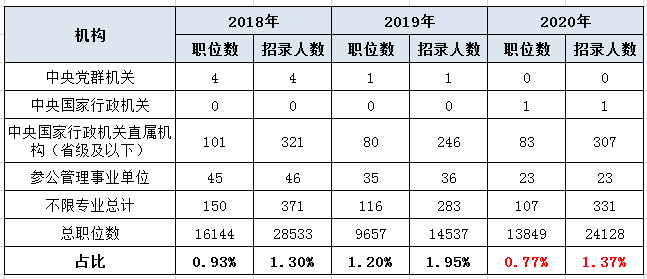 通过统计小编发现,近年来国考专业要求越来越严苛,不限专业职位逐年递减。2020年国考不限专业减少至107个职位,仅占总职位的0.77%;招录331人,占总人数的1.37%。而这些职位可想而知竞争要有多激烈,所以建议能小伙伴们尽量报考有专业限制的职位;而不得已报考这些职位的考生一定要努力准备笔试,提高上岸几率。