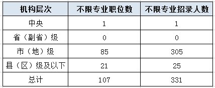 通过统计小编发现,不限专业职位有85个岗位都在市(地)级单位,占不限专业总职位的82.5%;21个职位在县(区)级及以下,仅有一个在中央机关。