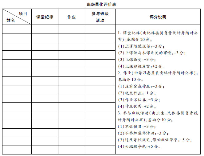 其次,评价内容不全面,指标不够具体,可量化性低。班级量化指标只包含课堂纪律、作业和参与班级活动三项,没有将学生的其他方面的表现纳入评价范围,内容不够全面。上课积极发言、作业优秀、为班级争光等量化评价指标没有具体量化标准,难以判断。