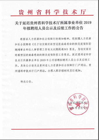 关于延迟贵州省科学技术厅所属事业单位2019年拟聘用人员公示及后续工作的公告