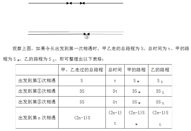 由上表可知,甲乙走过的总路程、总时间、甲的路程、乙的路程存在的比例关系均为1:3:5:……:(2n-1)。知道这个比例关系,就可以解决直线异地多次相遇的所有题目。