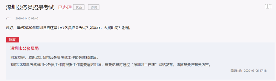 3月6号,网友咨询2020年深圳是否还举办公务员招录考试?官方给出答复啦!!!