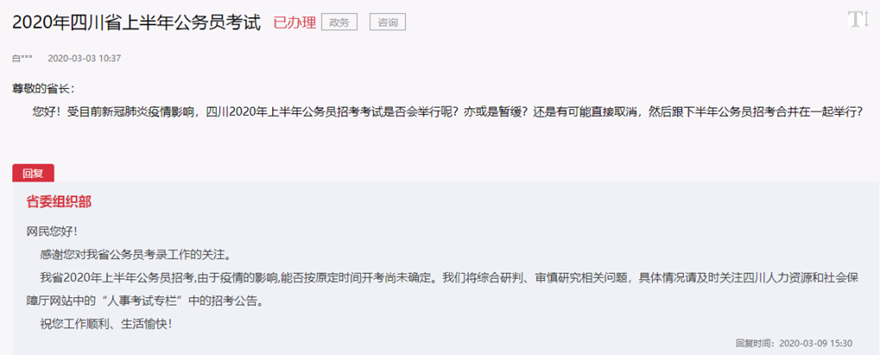 考生在人民网上咨询,四川2020年上半年公务员招考考试是否会举行?还是暂缓?还是有可能直接取消,跟下半年公务员招考合并在一起举行?