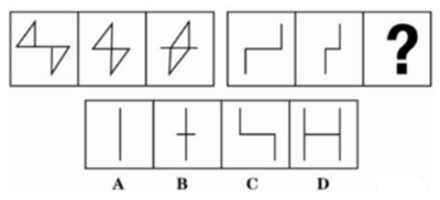 解析:此题选C。观察九宫格,会发现每行有旋转规律,第一行图形每次逆时针旋转90°,第二行图形每次逆时针旋转90°,所以第三行图形也遵循相同规律。故本题选C。 三、去同存异 例3:从所给的四个选项中,选择最合适的一个填入问号处,使之呈现一定的规律性() 。