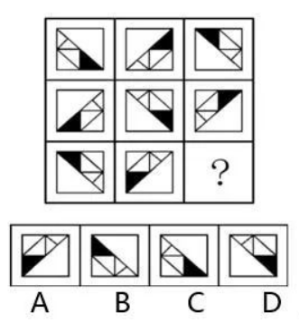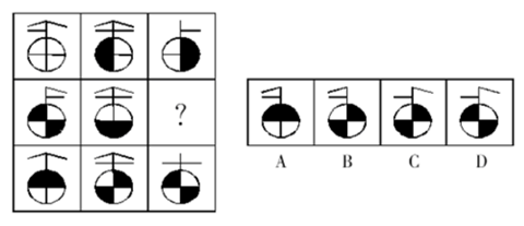 解析:此题选A。九宫格每行前两个图形上半部分去同存异得到第三个图形上半部分,排除C、D;下半部分是规律叠加,叠加规律为:白 黑=白,白 白=黑,黑 白=黑,黑 黑=白。故选A。 做下来,你会发现上面的几道题目图形整体相似度很高,所以遇到相似的图形可以优先考虑文章中列出的几种规律。