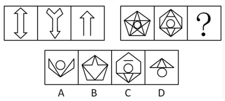 解析:此题选D。第一组图形中,将第2个图形上下翻转后,再与第一个图形进行去异存同的叠加运算,第二组图形满足相同规律。故选D。 五、规律叠加 例5:从所给的四个选项中,选择最合适的一个填入问号处,使之呈现一定的规律性() 。